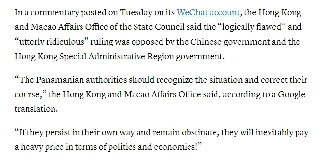 A ranar Talata (3 ga Fabrairu), Ofishin Harkokin Hong Kong da Macao na Majalisar Jiha ya buga wani labari a asusunsa na WeChat mai taken "Hong Kong da Macao Ping: Panama Ta Yi Wa Kanta Face Ta Girbi Sakamakon," wanda ya soki hukuncin Panama da kakkausar murya a matsayin "wauta" da "mika wuya ga mulkin mallaka da kuma yin aiki a matsayin mai taimaka wa mugunta." Labarin ya bukaci hukumomin Panama "su fahimci lamarin su kuma su juya daga hanyar da ba ta dace ba," kuma ya yi gargadin cewa "idan suka ci gaba da bin hanyar da ba ta dace ba kuma suka ci gaba da taurin kai, za su fuskanci babban sakamako a siyasance da tattalin arziki."