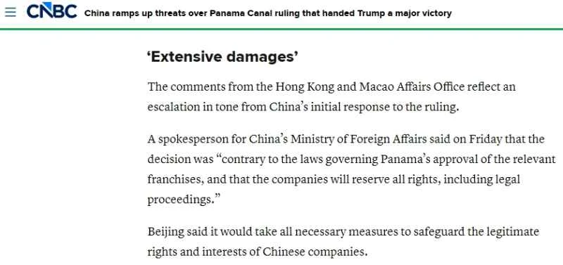 A cewar CNBC, Ma'aikatar Harkokin Wajen China ta bayyana a ranar Juma'a (30 ga Janairu) cewa hukuncin "ya saba wa dokokin da suka shafi amincewa da Panama na haƙƙin mallakar kamfanoni masu dacewa, kuma kamfanonin za su kiyaye dukkan haƙƙoƙi, gami da bin diddigin shari'a." China za ta ɗauki dukkan matakan da suka wajaba don kare haƙƙoƙi da muradun kamfanonin China da suka dace.